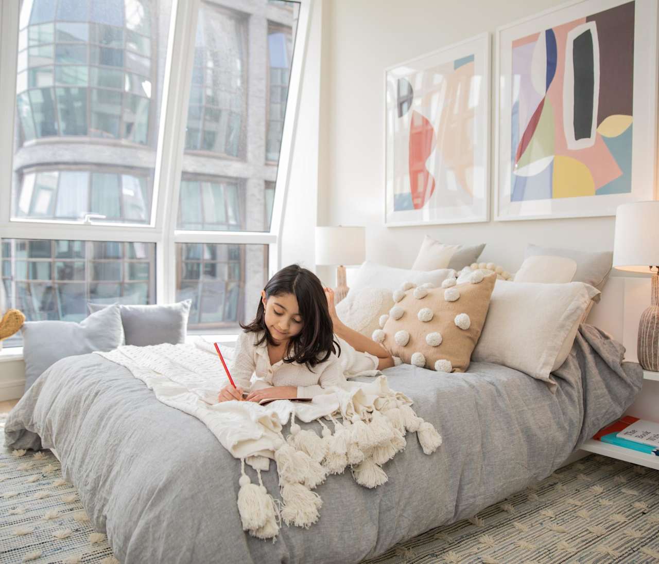 Defined by soaring, dramatic bay windows—illuminate elegant yet relaxed interiors. With ceiling heights up to 10-feet 9-inches, these radiant, loft-like spaces temper bold modernism with the warm patina of an exquisite material palette of stone, marble, bronze, and oak.