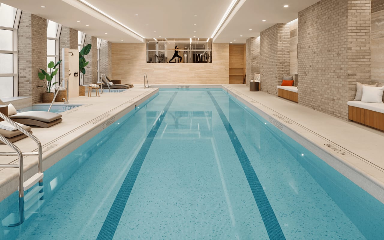 The 75-foot long saline-system swimming pool is a showpiece of Lantern House — the centerpiece of a soaring double-height space, filled with light, running alongside the celebrated High Line.